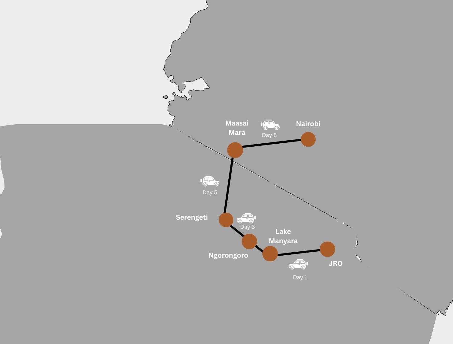 Lake Manyara · Ngorongoro · Serengeti · Maasai Mara · Nairobi