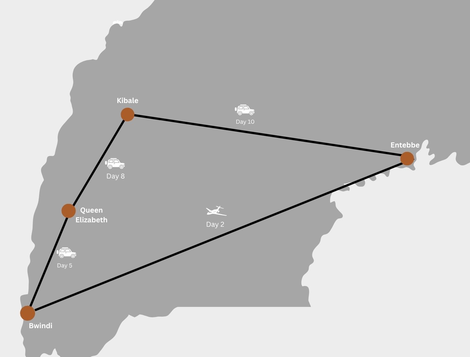 Entebbe · Kibale Forest National Park · Queen Elizabeth National Park · Bwindi Impenetrable Forest