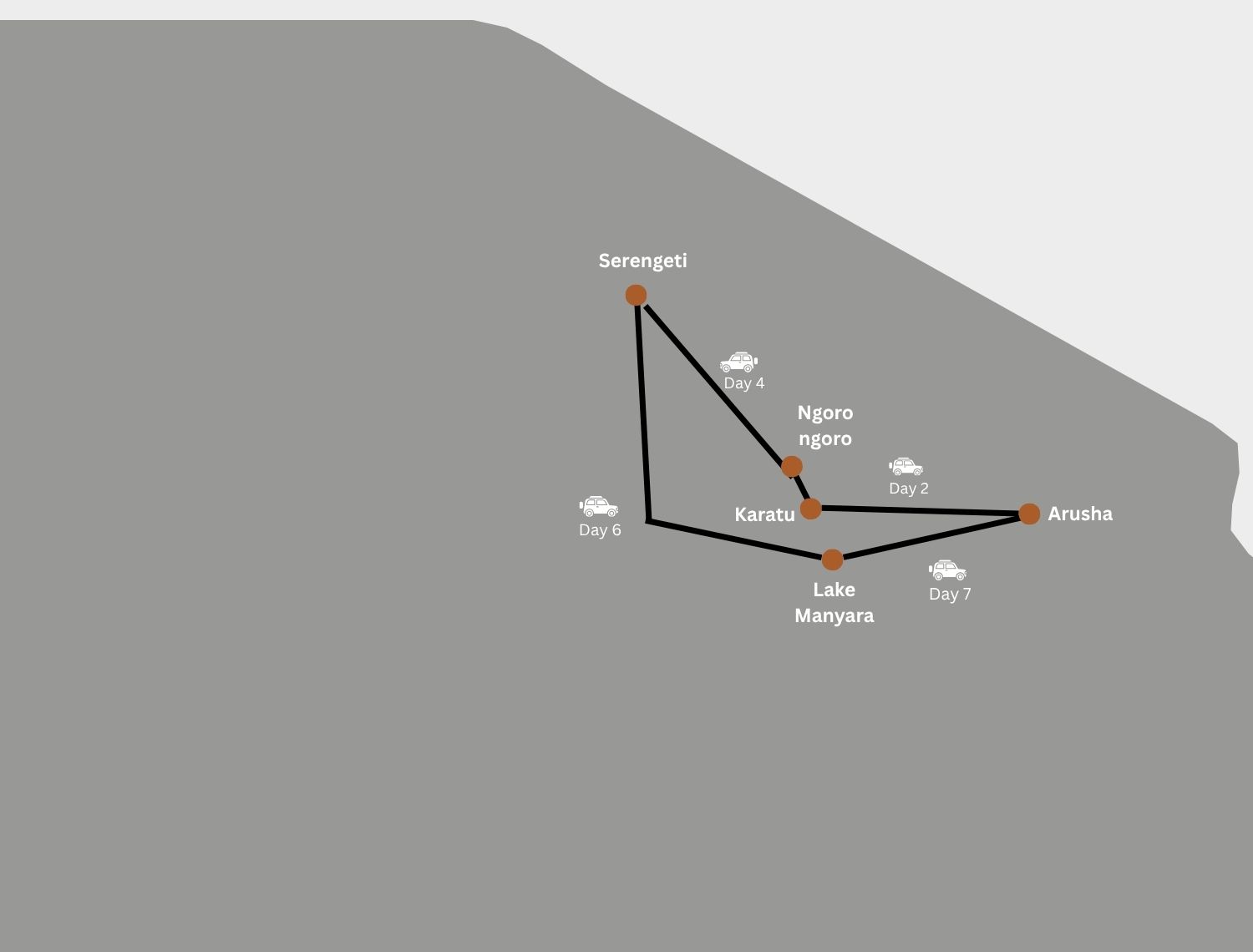 Arusha · Karatu · Ngorongoro · Serengeti · Lake Manyara